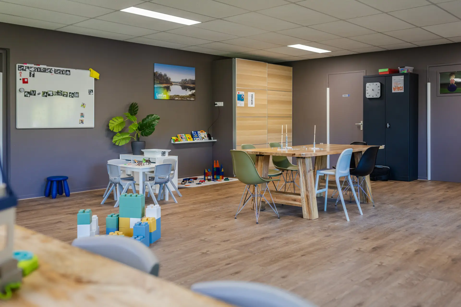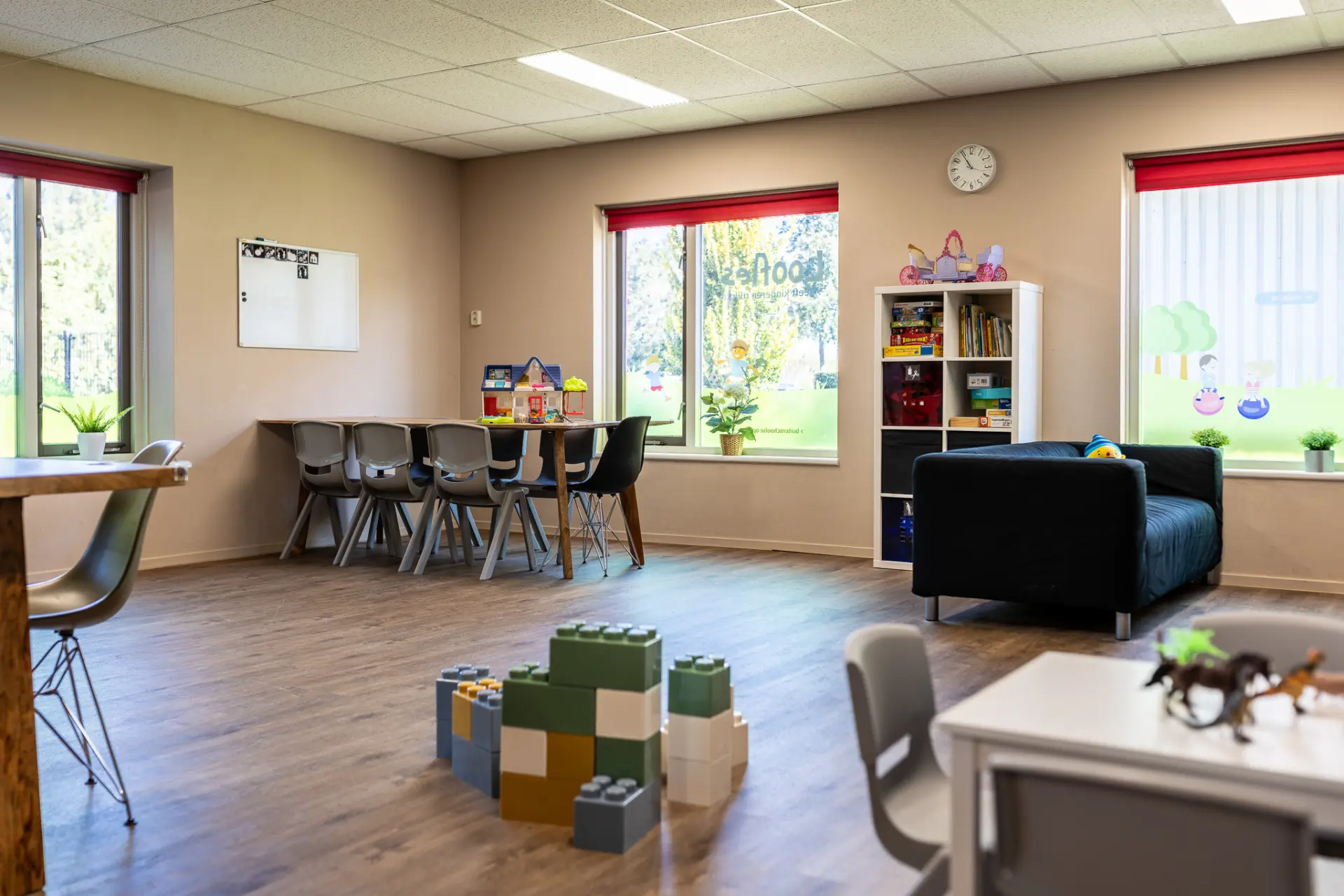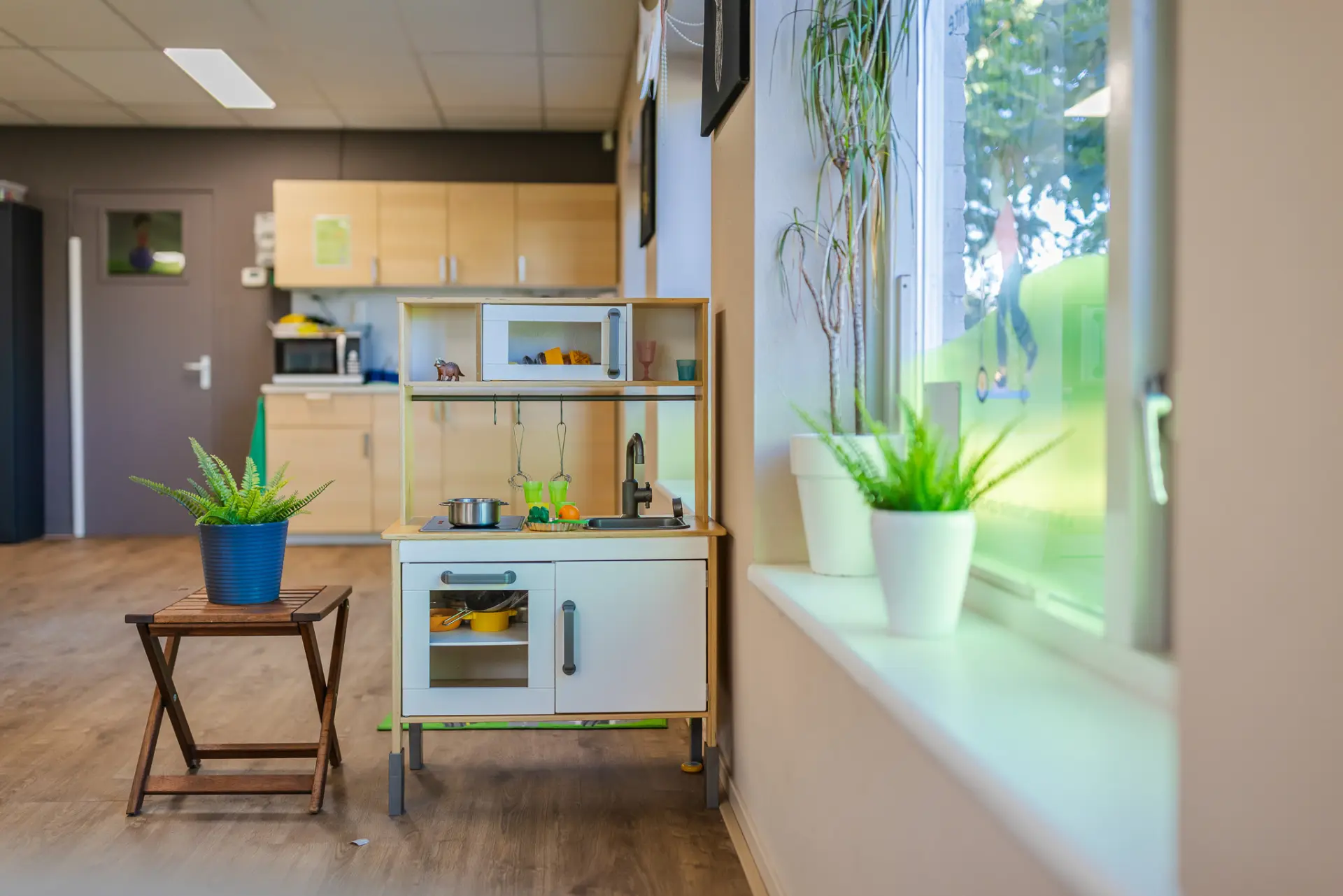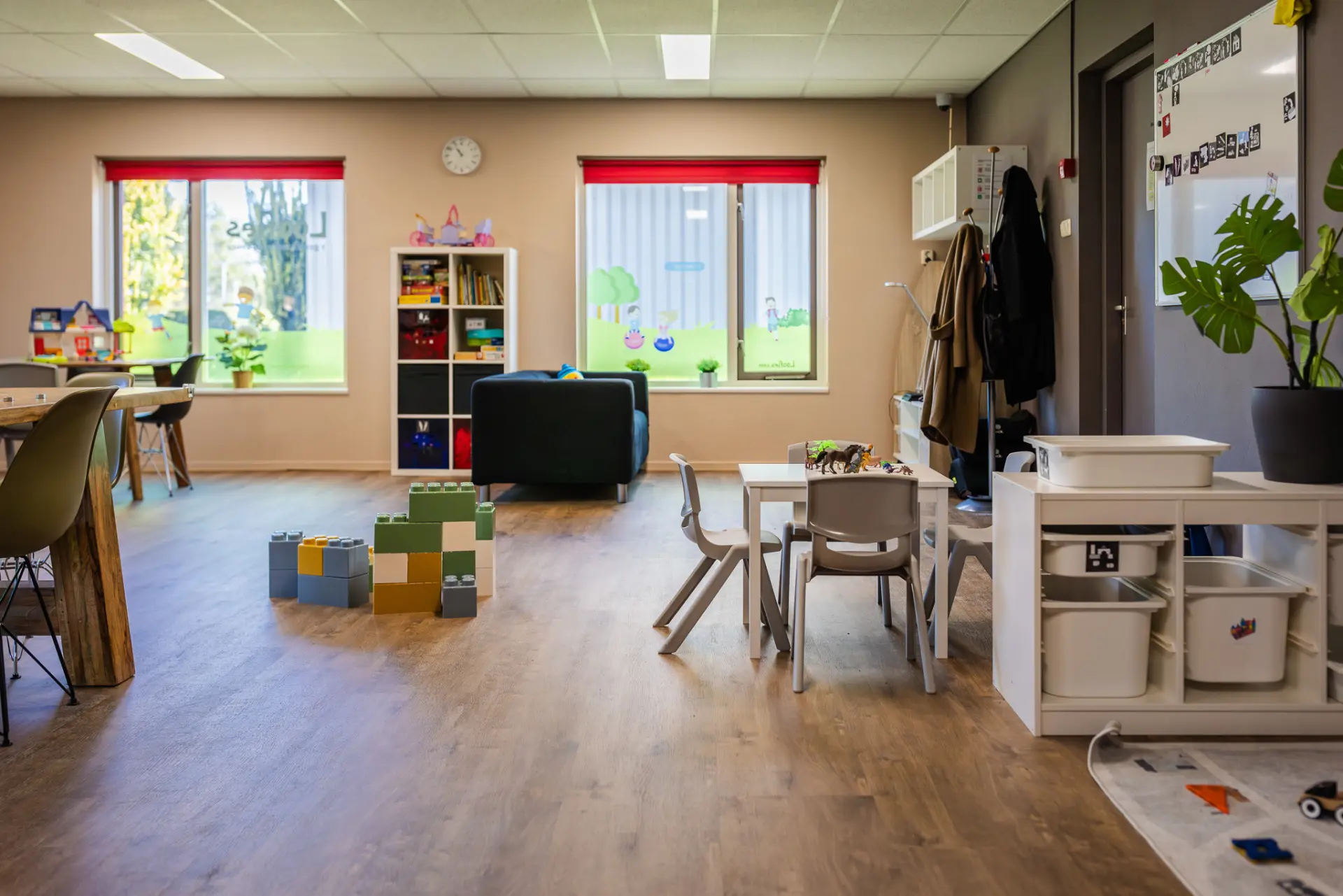 De groepsruimtes zijn licht en ruim, met grote ramen en een inrichting die rust uitstraalt. Houten tafels, open kasten en speelhoeken zorgen voor structuur én keuzevrijheid. Alles is overzichtelijk en op kindhoogte. Voor kinderen die snel overprikkeld raken, zijn er meerdere rustige plekken: zitzakken, banken en kleine hoekjes waar ze even kunnen terugtrekken.